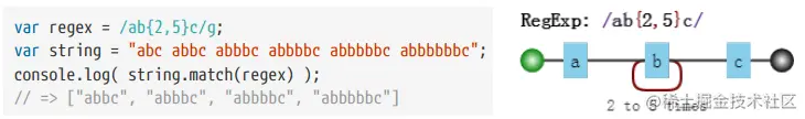 示例:全局匹配,使用match()方法返回字符串中与表达式匹配的所有内容。b{2,5}表示字符b出现2到5次。