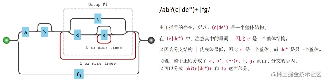 这里,我们来分析一个正则 /ab?(c|de*)+|fg/:
