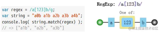示例:全局匹配,使用match()方法返回字符串中与表达式匹配的所有内容。[123]表示这个位置的字符可以是1、2、3中的任意一个