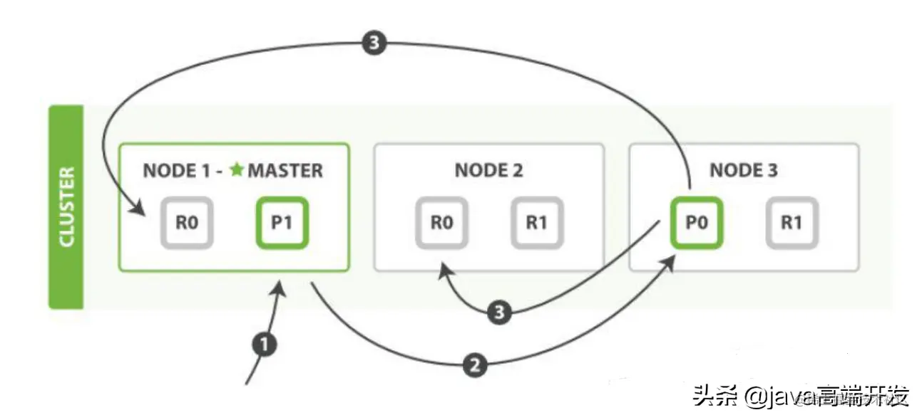 第二步:节点 1 接受到请求后,使用文档_id 来确定文档属于分片 0。请求会被转到另外的节点,假定节点 3。因此分片 0 的主分片分配到节点 3 上。
