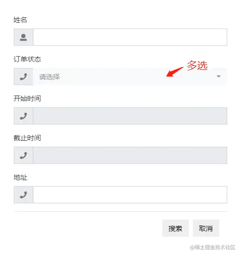 - 订单状态:搜索订单状态相同于多个状态其中一个的数据(下拉选择框中是多选)
