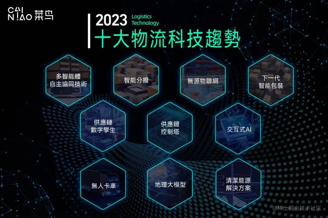 早在今年年初,菜鸟就对外公布了2023物流技术的十大趋势,供应链数字孪生、交互式AI、无人卡车、地理大模型等都被列入其中。