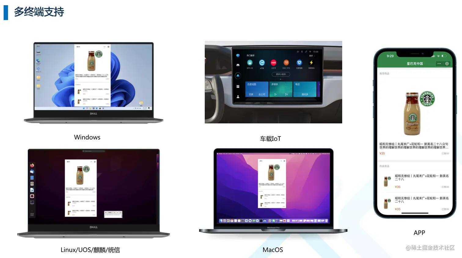 不仅如此,FinClip 还支持手机以外的多种终端,包括 Linux、Windows、MacOS、麒麟等操作系统。这意味着,PC 端、车载设备、智能电视都能使用小程序了,实现了小程序的“一次开发,到处运行”,同时触达众多流量平台,而不仅仅局限于微信生态。
