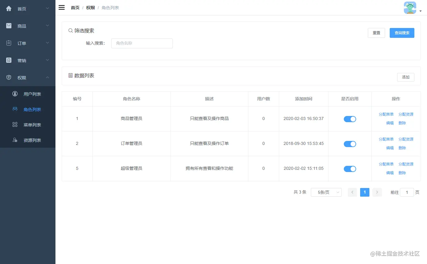 角色管理主要包括角色信息的管理、给角色分配菜单、给角色分配资源的功能。