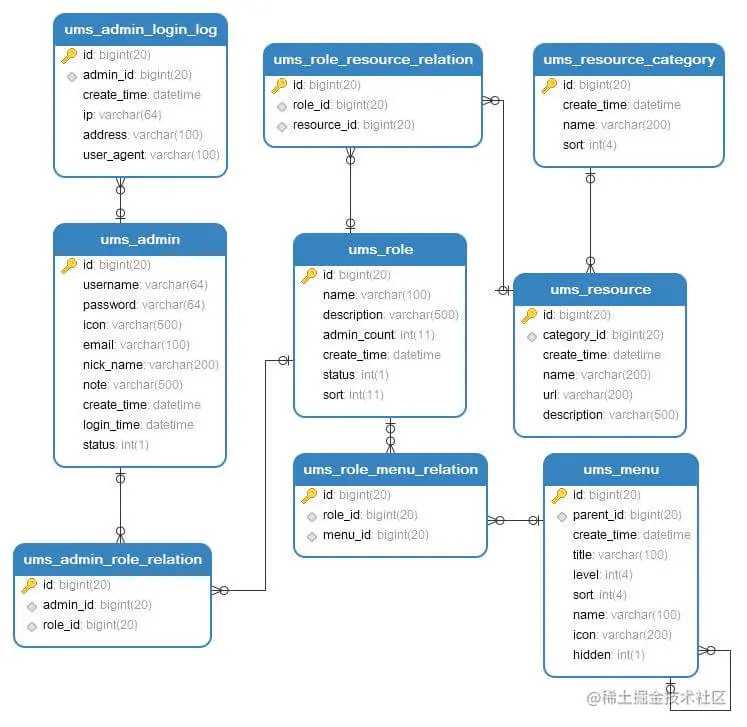 接下来我们就可以根据整理好的思维导图来设计数据库表了,这是我设计好的mall项目权限模块数据库表结构。