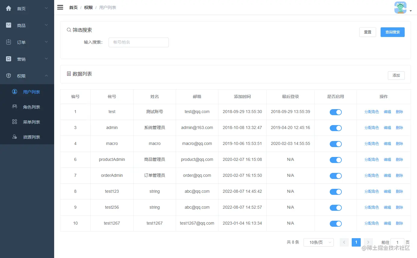 从系统效果图可以看出,mall项目的权限功能共分为用户管理、角色管理、资源管理、菜单管理四个功能,下面分别介绍下这些功能。