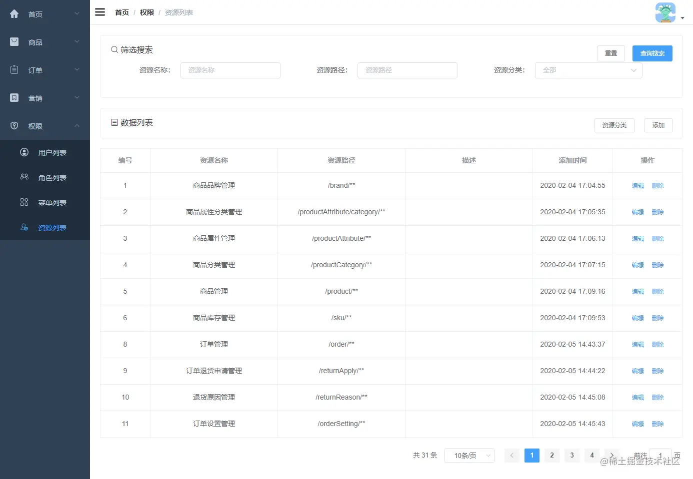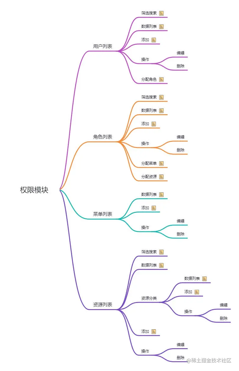 在开始开发权限模块之前,我们先得把功能设计出来,可以出个效果图,由于mall项目权限功能已经开发完毕了,这里可以直接参考它的效果图。