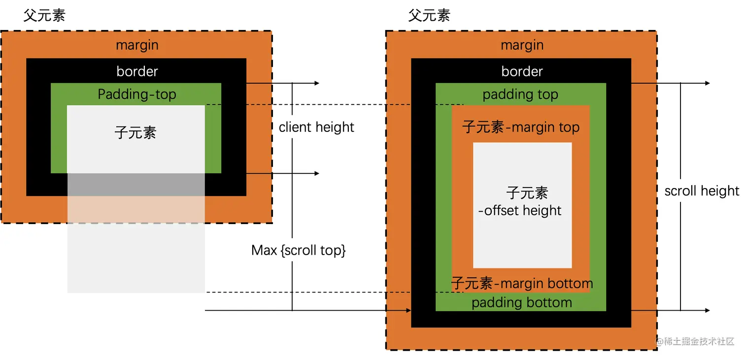 只读属性。描述了元素内容高度的度量,包括由于溢出导致的视图中不可见内容。我们可以hack一下,把父元素中不可见的内容也展示出来,子元素在垂直方向可以分为两部分:外层的margin和内部的offsetHeight: