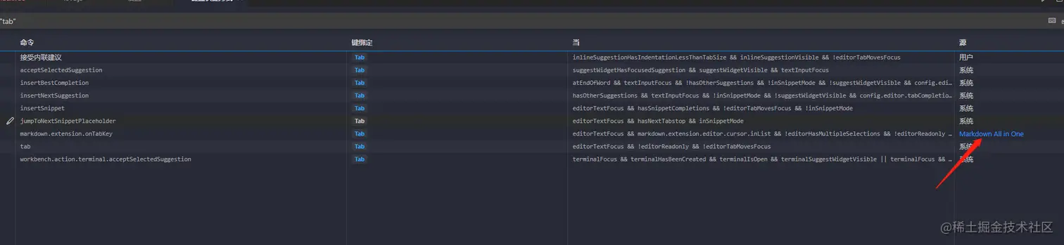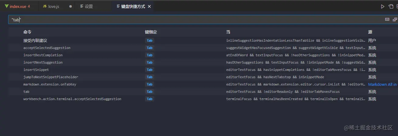 vscode->文件->首选项->键盘快捷方式->输入 "tab"