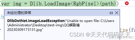 DlibDotNet.ImageLoadException HResult=0x80131500 Message=Unable to open file…… 天天代码码天天 2023-07-18 91 阅读1分钟 报错信息 原因 图片路径中含有中文 解决办法一 自己修改,去掉图片路径中的中文 解决办法二 设置编码方式 Dlib.Encoding = Environment.OSVersion.Platform == PlatformID.Win32NT ? Encoding.GetEncoding(CultureInfo.CurrentCulture.TextInfo.ANSICodePage) : Encoding.UTF8;