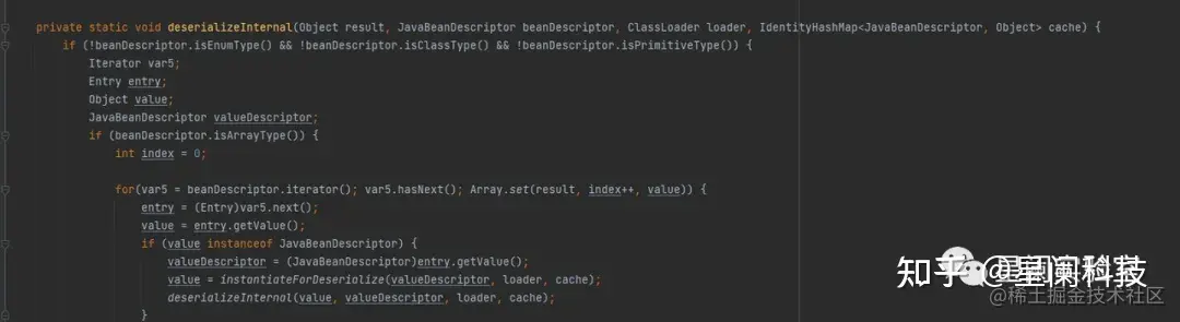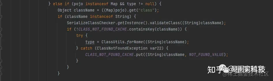 若pojo为map实例,则获取key为"class"的值,并通过反射得到class所对应的类type,后续处理中经过判断:如果type不是Map的子类、不为Object.class且不是接口,则进入else,对type通过反射进行了实例化,得到对象dest。