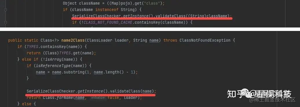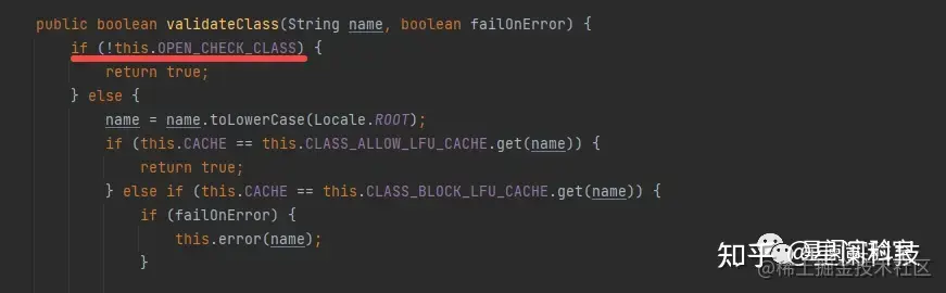 validateClass方法首先会对OPEN_CHECK_CLASS属性进行判断,如果这个属性为false,那么就不会对传入类进行检查,直接返回。那么其中一种绕过的方式就是,设置OPEN_CHECK_CLASS属性为false,从而绕过黑名单检查。