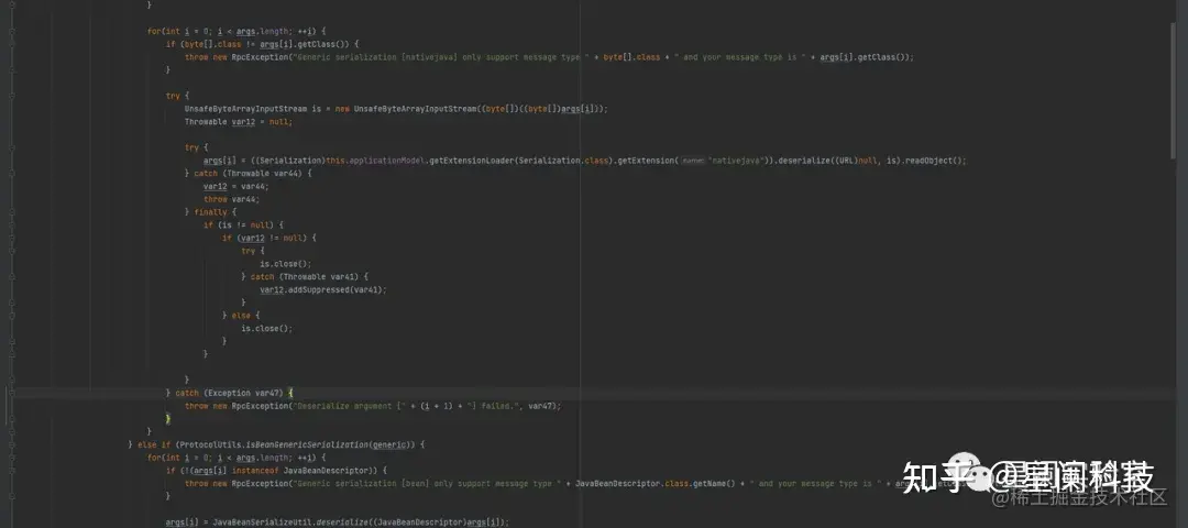 遍历args,检查args[i]是否为byte[]类型,如果是,则将字节数组转化为输入流,然后,代码使用ExtensionLoader.getExtensionLoader方法获取了一个Serialization类的扩展实现对象,并调用其deserialize方法来将输入流中的字节流反序列化为一个Java对象,代码调用readObject方法来读取反序列化后的Java对象,并将其赋值给原始的args[i]参数,从而将字节数组转换为Java对象,后续利用CC4触发gadget。