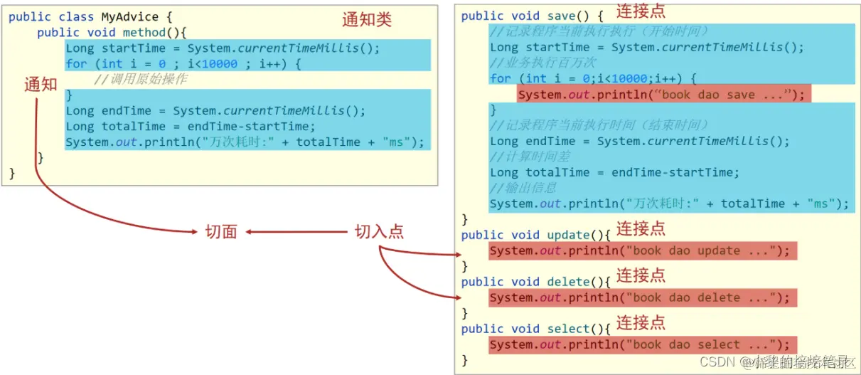 update和delete只有打印没有计算万次执行消耗时间,但是在运行的时候已经有该功能,那也就是说update和delete方法都已经被增强,所以对于需要增强的方法我们给起了一个名字叫切入点(3) 执行update和delete方法的时候都被添加了一个计算万次执行消耗时间的功能,将这个功能抽取到一个方法中,换句话说就是存放共性功能的方法,我们给起了个名字叫通知