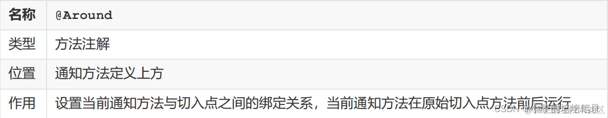 前置、后置、返回后、抛出异常后通知。▶ 环绕通知获取方式