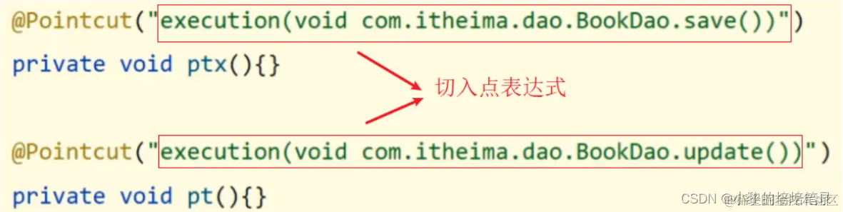 public class MyAdvice { @Pointcut("execution(void com.itheima.dao.BookDao.update())") private void pt(){} public void method(){ System.out.println(System.currentTimeMillis()); } }注意:切入点定义依托一个不具有实际意义的方法进行,即无参数、无返回值、方法体无实际逻辑。