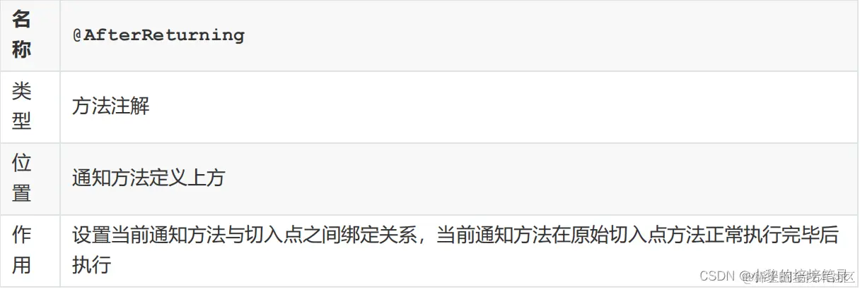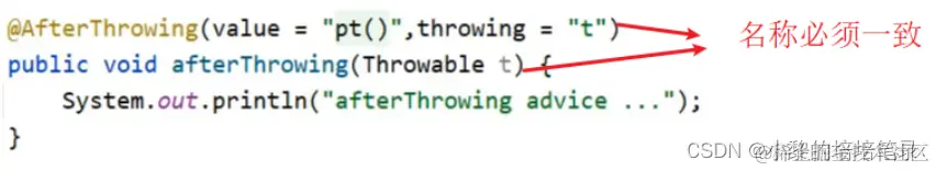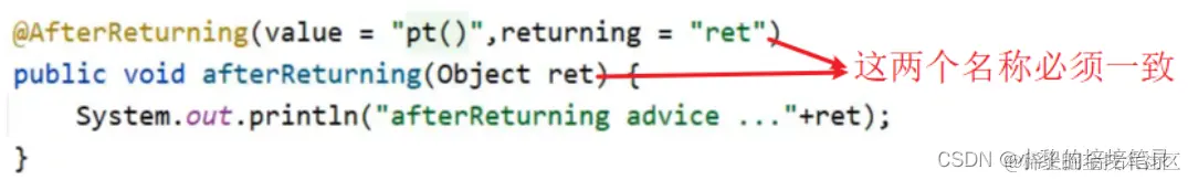 @Component @Aspect public class MyAdvice { @Pointcut("execution(* com.itheima.dao.BookDao.findName(..))") private void pt(){} @AfterReturning(value = "pt()",returning = "ret") public void afterReturning(Object ret) { System.out.println("afterReturning advice ..."+ret); } //其他的略 }注意: