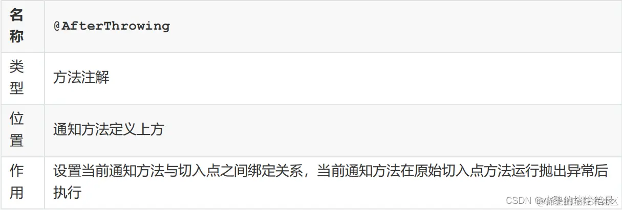@Component @Aspect public class MyAdvice { @Pointcut("execution(* com.itheima.dao.BookDao.findName(..))") private void pt(){} @AfterThrowing(value = "pt()",throwing = "t") public void afterThrowing(Throwable t) { System.out.println("afterThrowing advice ..."+t); } //其他的略 }如何让原始方法抛出异常,方式有很多,