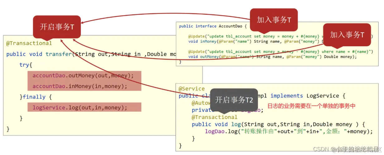 ● AccountDao的inMoney方法的事务T2加入到transfer的事务T中