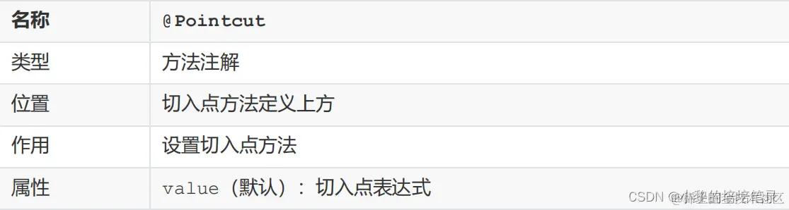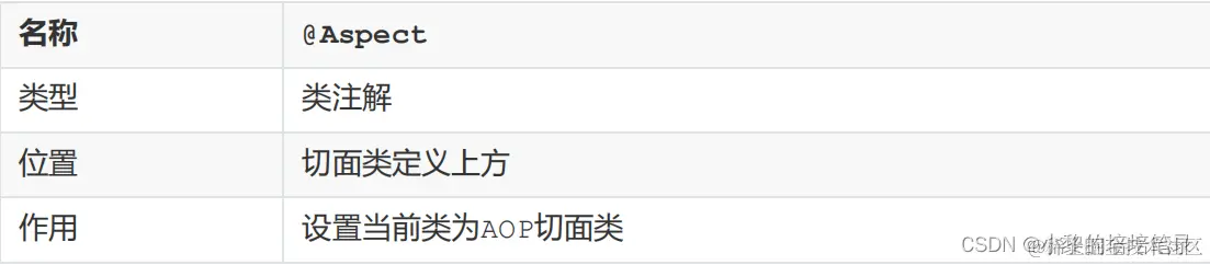 (4) 通知是要增强的内容,会有多个,切入点是需要被增强的方法,也会有多个,那哪个切入点需要添加哪个通知,就需要提前将它们之间的关系描述清楚,那么对于通知和切入点之间的关系描述,我们给起了个名字叫切面