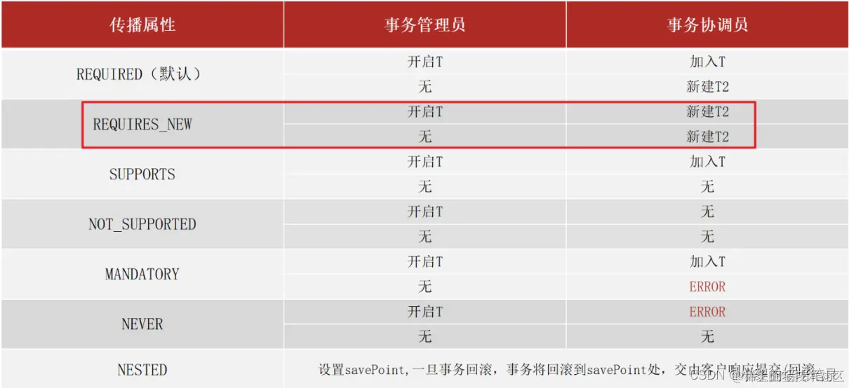 ● 这和我们的需求不符,这个时候我们就想能不能让log方法单独是一个事务呢?要想解决这个问题,就需要用到事务传播行为,所谓的事务传播行为指的是: