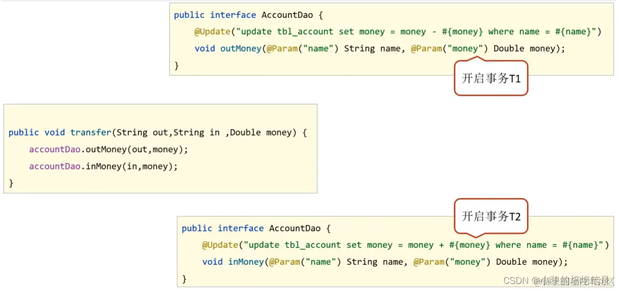● AccountDao的outMoney因为是修改操作,会开启一个事务T1
