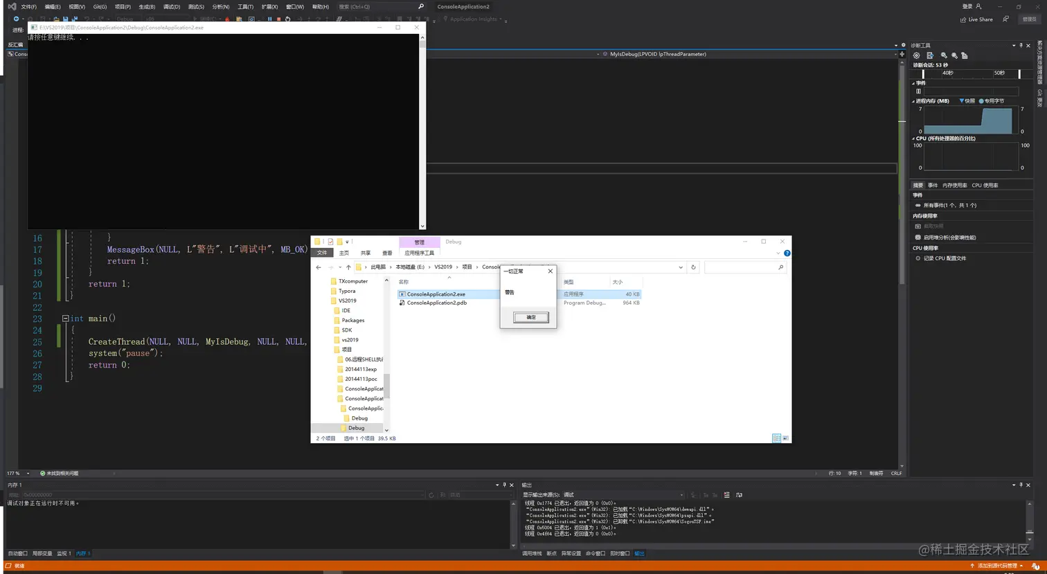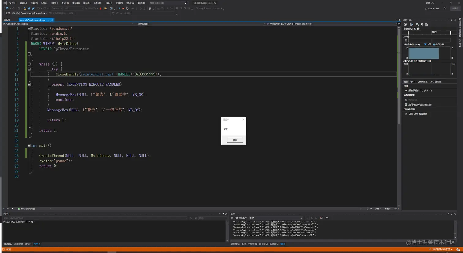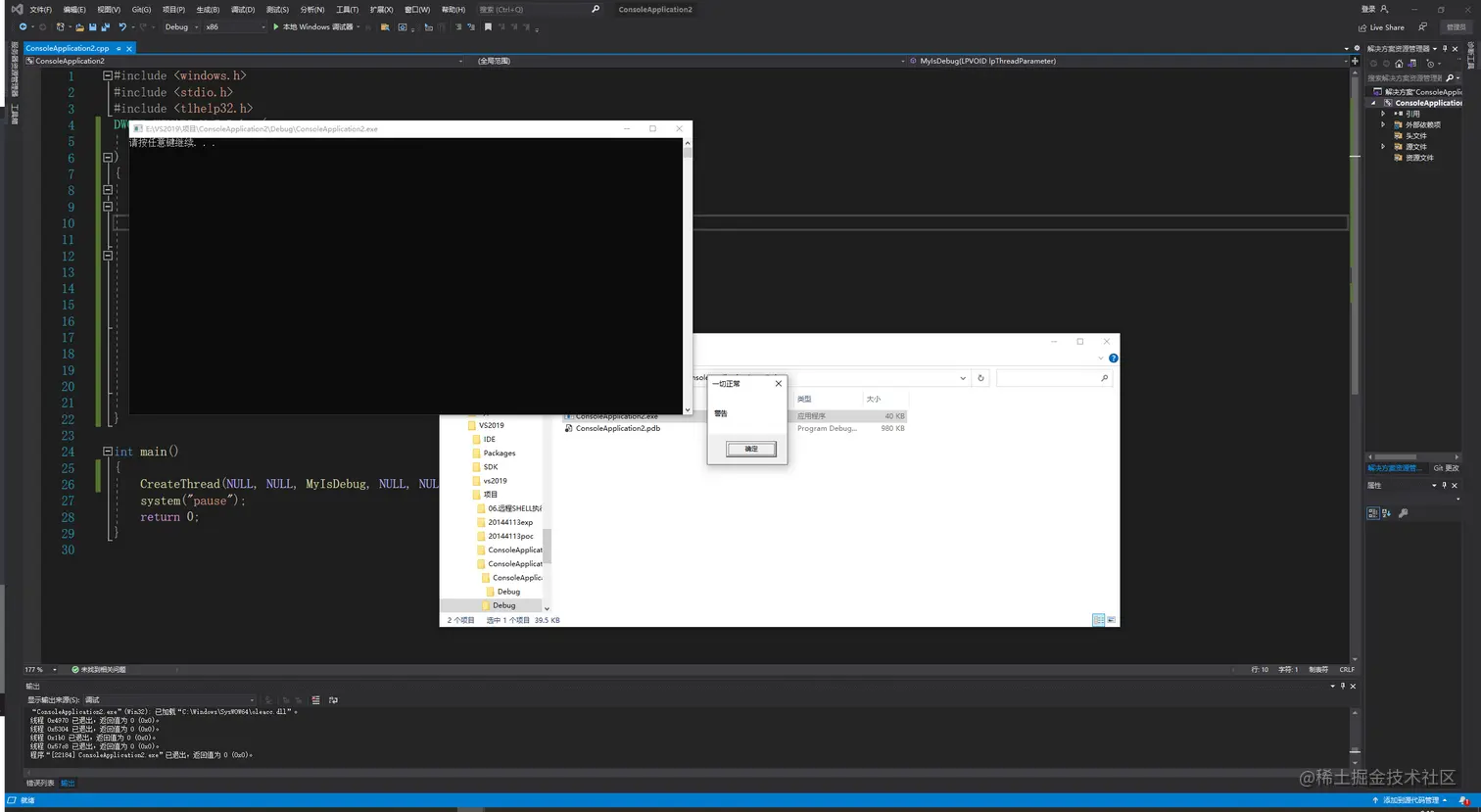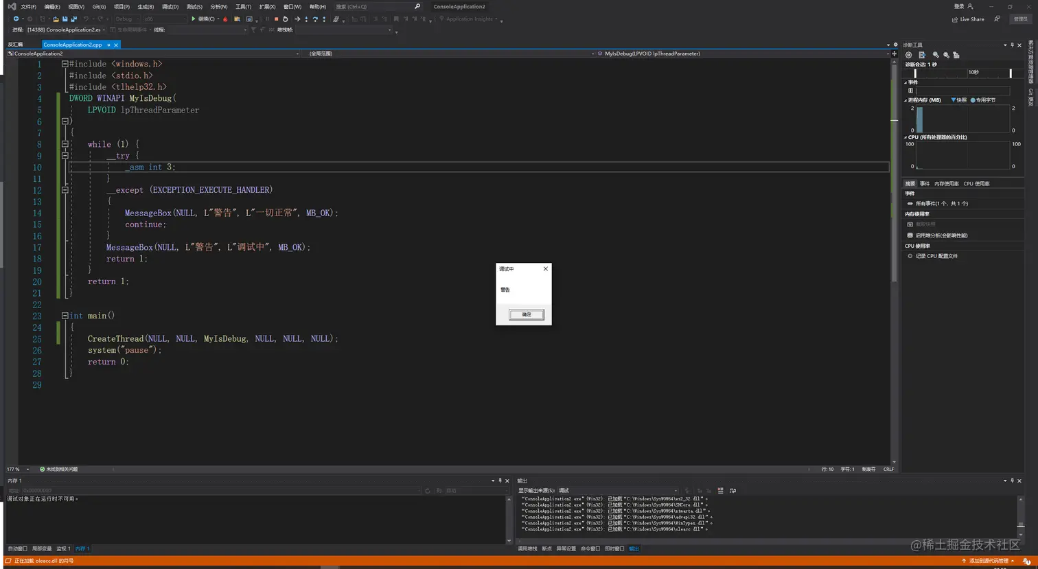 这里是注册一个线程,在线程回调函数,设一个循环,循环里面放入一个int 3断点,也就是CC断点,直接在VS中运行,编译器也是一个调试器,也会被检测出来: