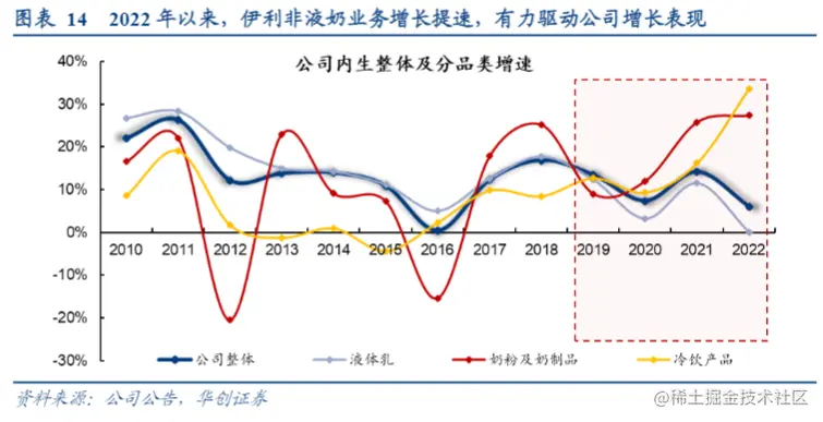 **另一方面,伊利采取了多品类均衡布局并差异化发展的策略。**对于不同品类的发展,伊利集团董事长兼总裁潘刚表示,伊利的产品线非常丰富,不同业务不同产品线所处的发展阶段不同,竞争格局也不同,所以采用的策略也是有差别的。对于处在发展窗口期的品类,一定要把握机会快速发展;对于潜在业务还是要保持耐心,把握好公司经营的方向和节奏。
