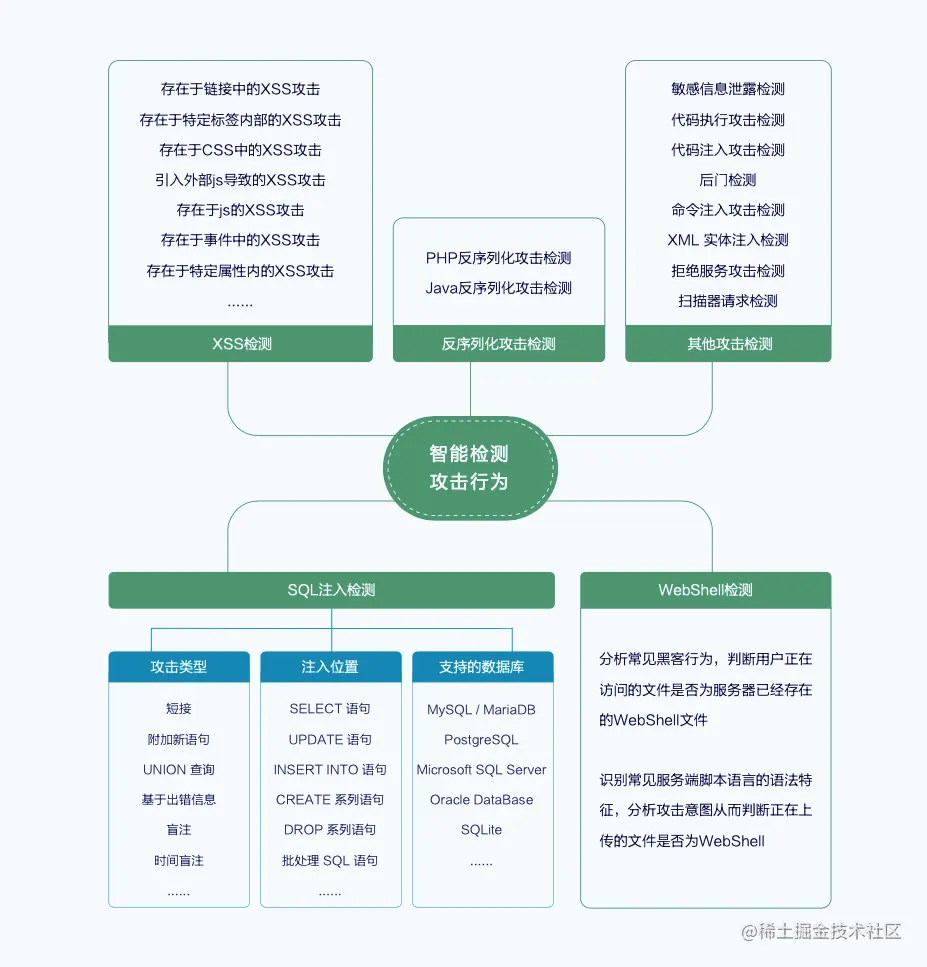与规则匹配型威胁检测方式相比,智能语义分析技术具有准确率高、误报率低的特点。以SQL注入检测为例: