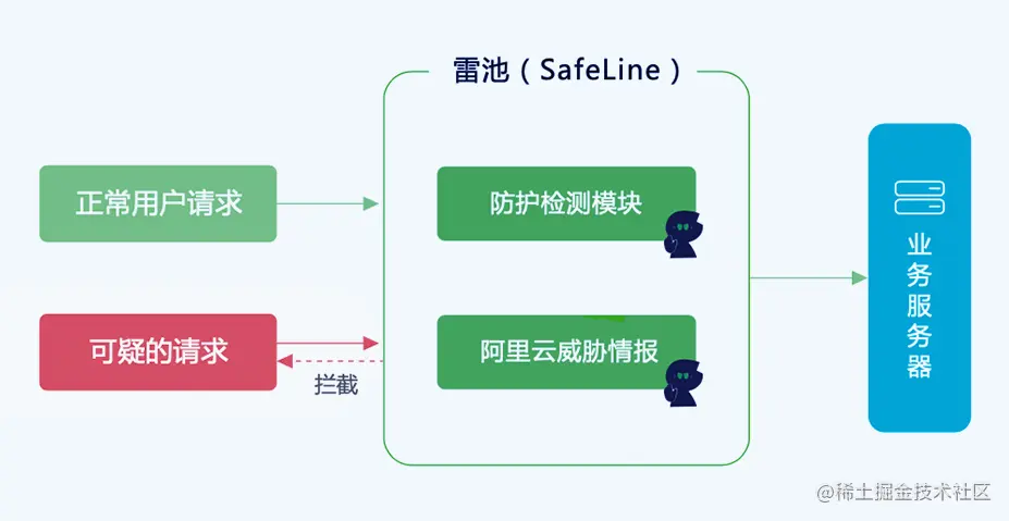 雷池以反向代理方式接入,优先于网站服务器接收流量,对流量中的攻击行为进行检测和清洗,将清洗过后的流量转发给网站服务器。