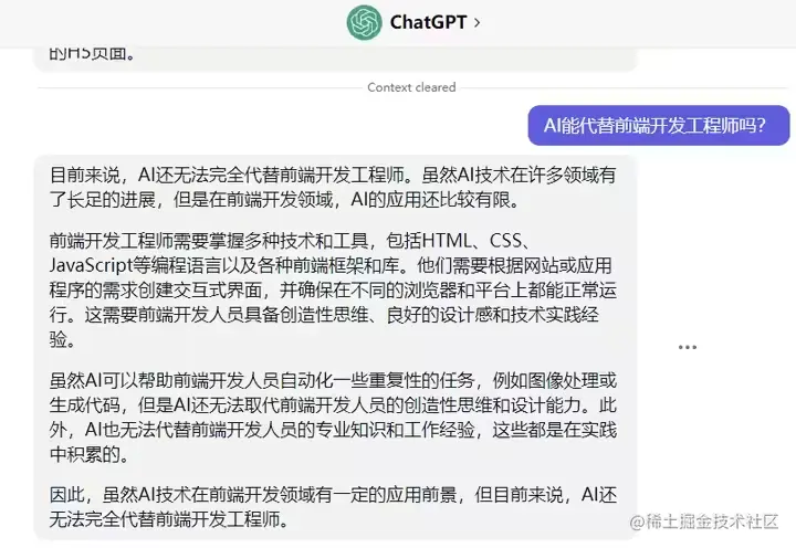 自从ChatGPT出现以来,我们就开始热切地讨论哪些职业会被替代。文案,收银,翻译等等,甚至程序员也赫然在列,也充斥着前端程序员会被取代的说法。那我们今天就深入讨论一下ChatGPT到底能不能替代前端程序员。
