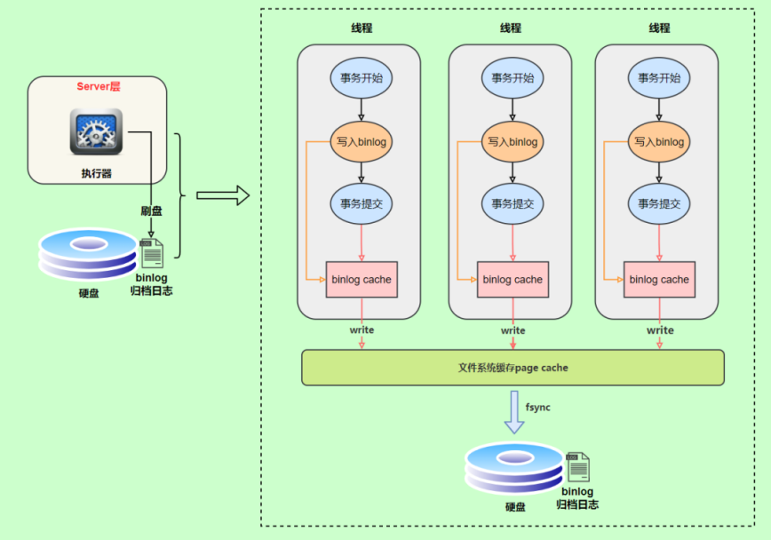 我们可以通过binlog_cache_size参数控制单个线程 binlog cache 大小,如果存储内容超过了这个参数,就要暂存到磁盘(Swap)。binlog日志刷盘流程如下:
