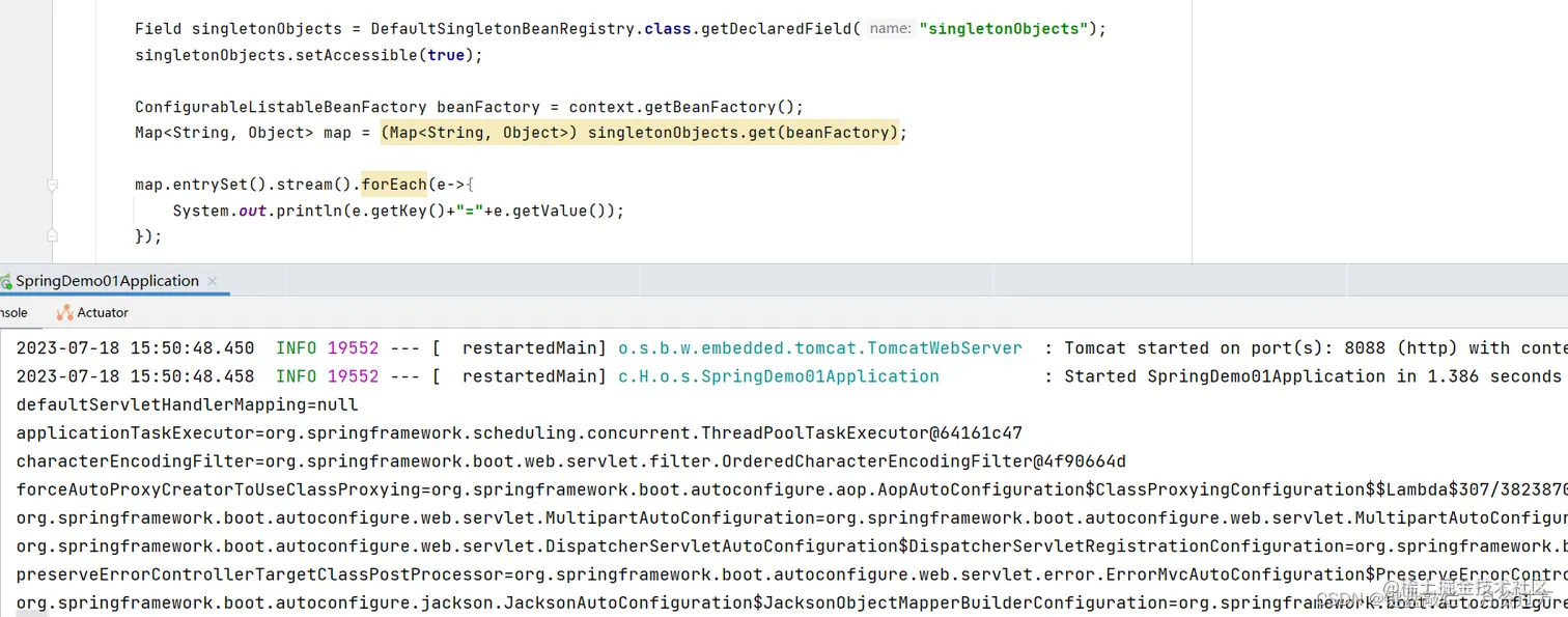 其一,我们可以在SpringApplication.run方法生成 ConfigurableApplicationContext的一个实现类中AbstractApplicationContext的getBean方法得知其底层是获取BeanFactory对象调用其中getBean方法的。