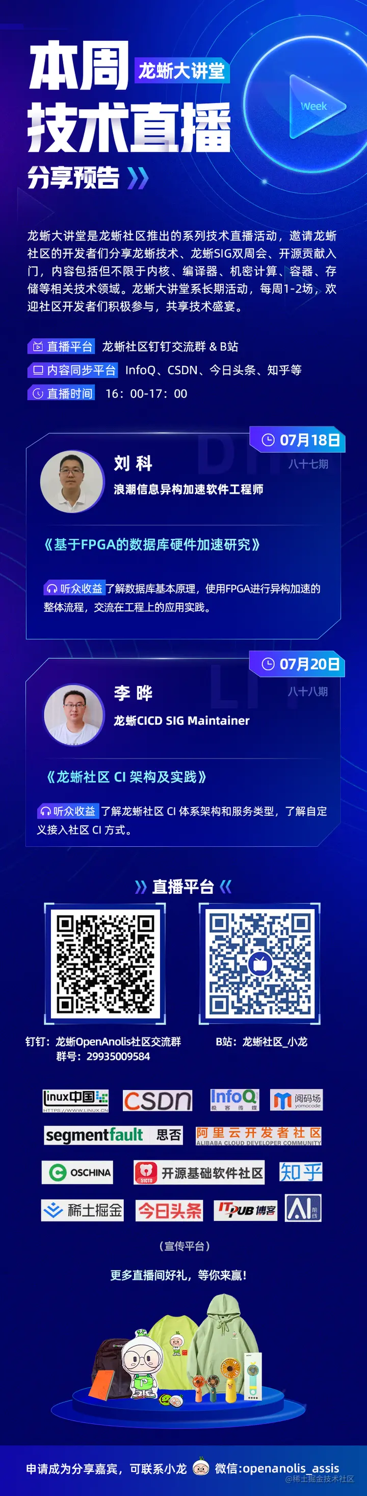 本周「龙蜥大讲堂」预告来啦!我们邀请了浪潮信息异构加速软件工程师刘科分享《基于 FPGA 的数据库硬件加速研究》、 CICD SIG Maintainer 李晔做《龙蜥社区 CI 框架及实践》主题演讲,精彩多多,快来扫码入群,预定前排小板凳观看直播!