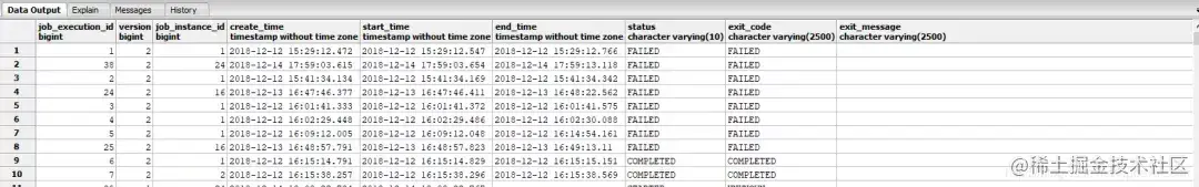这些属性对于一个job的执行来说是非常关键的信息,并且spring batch会将他们持久到数据库当中. 在使用Spring batch的过程当中spring batch会自动创建一些表用于存储一些job相关的信息,用于存储JobExecution的表为batch_job_execution,下面是一个从数据库当中截图的实例: