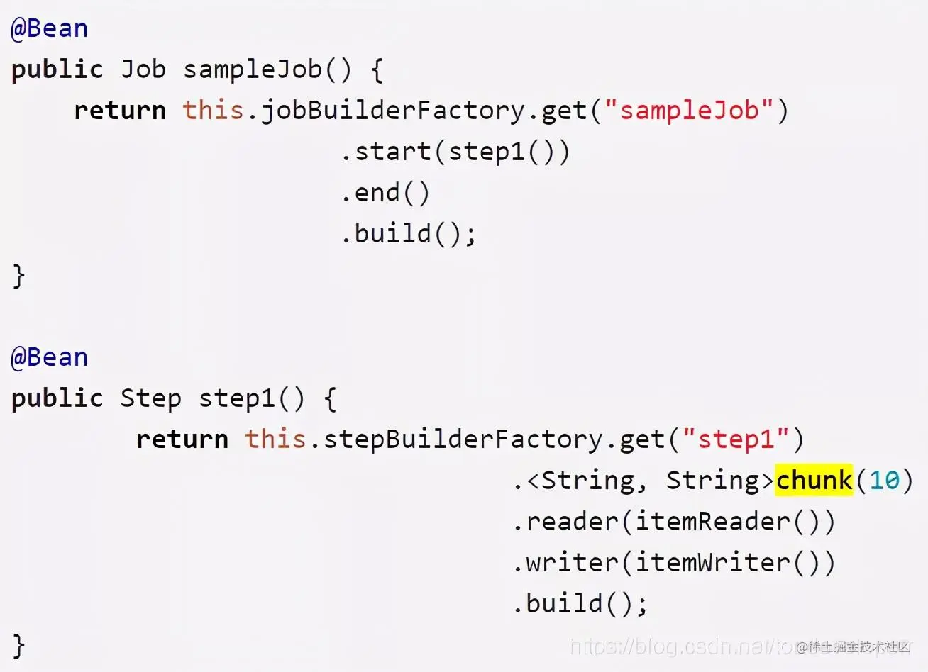 Spring Batch以SimpleJob类的形式提供了Job接口的默认简单实现,它在Job之上创建了一些标准功能。一个使用java config的例子代码如下: