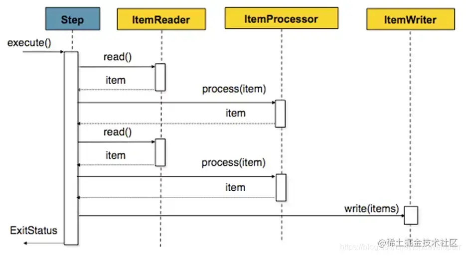 它的意思就和图示的一样,由于我们一次batch的任务可能会有很多的数据读写操作,因此一条一条的处理并向数据库提交的话效率不会很高,因此spring batch提供了chunk这个概念,我们可以设定一个chunk size,spring batch 将一条一条处理数据,但不提交到数据库,只有当处理的数据数量达到chunk size设定的值得时候,才一起去commit.