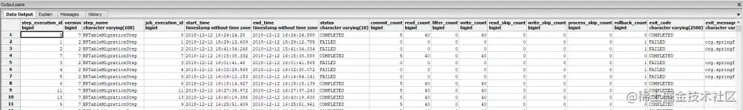 此外,每个步骤执行都包含一个ExecutionContext,其中包含开发人员需要在批处理运行中保留的任何数据,例如重新启动所需的统计信息或状态信息。下面是一个从数据库当中截图的实例: