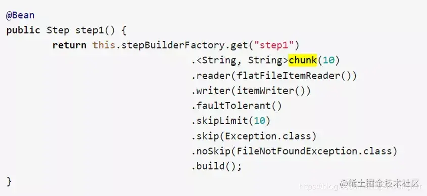 skipLimit方法的意思是我们可以设定一个我们允许的这个step可以跳过的异常数量,假如我们设定为10,则当这个step运行时,只要出现的异常数目不超过10,整个step都不会fail。注意,若不设定skipLimit,则其默认值是0.