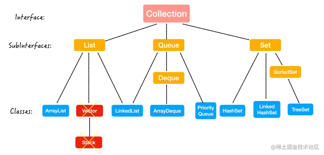 Java 集合,也称作容器,主要是由两大接口 (Interface) 派生出来的:Collection 和 Map