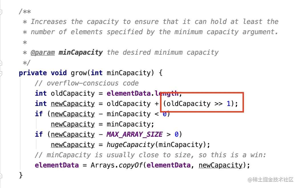 这是 ArrayList 的扩容实现,这个算术右移操作是把这个数的二进制往右移动一位,最左边补符号位,但是因为容量没有负数,所以还是补 0.