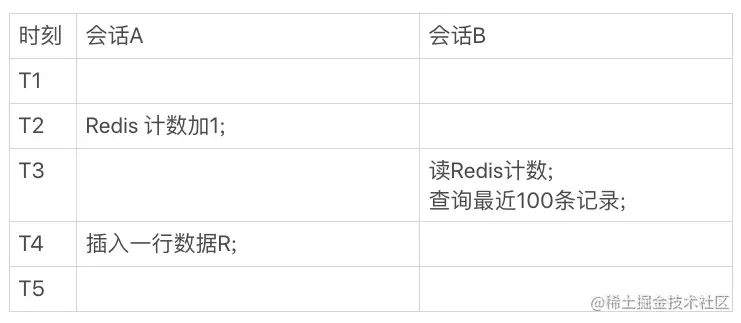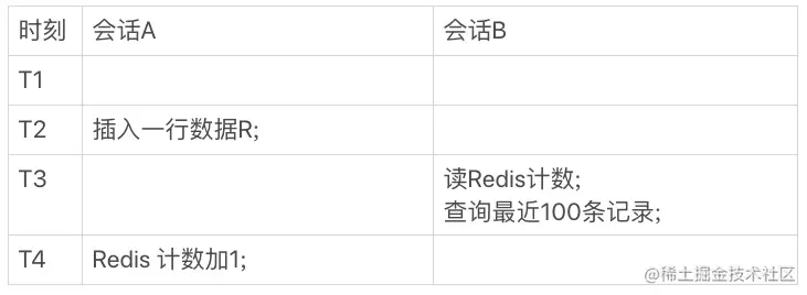 很明显,会话 A 插入数据,但是还没来得及更新 Redis;会话 B 查询 Redis 计数,并向 MySQL 查询最新的 100 条记录。