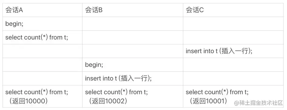 - 会话 A 先启动事务并查询一次表的总行数;