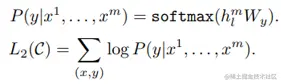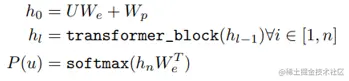 具体方法是代入 Transformer 模型,下式中的模型由 L 组隐藏层组成,最初输入隐藏层的数据是词编码 U 乘词嵌入参数 We 加上位置参数 Wp;后面经过 L 个层(如上图左侧的 Transformer 组)处理。