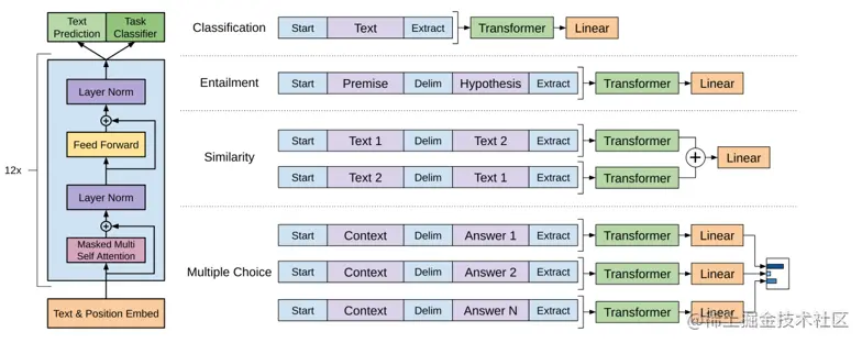 其左侧展示了 12 层的 Transformer Decoder 模型,与 Transformer 基础模型一致。右侧展示了在 Fine-Tune 时,先将不同任务通过数据组合,代入 Transformer 模型,然后在基础模型输出的数据后加全连接层(Linear)以适配标注数据的格式。