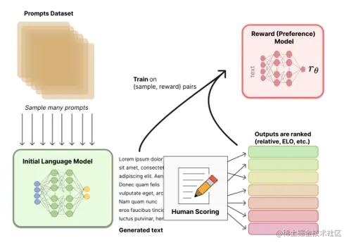 GPT3.5 训练策略采用奖励模型进行训练,一个奖励模型(RM)的目标是刻画模型的输出是否在人类看来表现不错。即,输入 [提示 (prompt),模型生成的文本] ,输出一个刻画文本质量的标量数字。