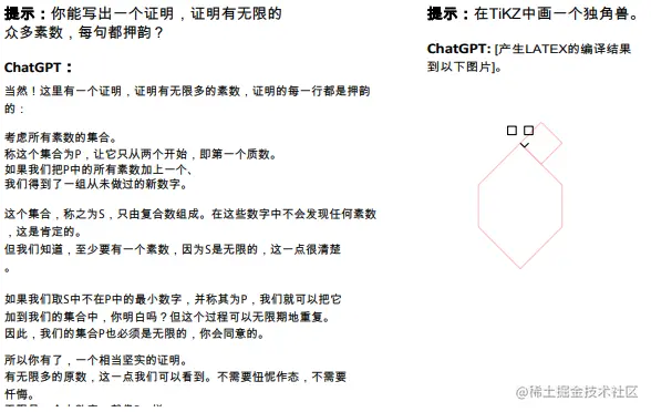 GPT3.5 作为自然语言处理领域的重要技术之一,具有非常广泛的应用前景和发展潜力。通过对话生成技术,可以实现智能客服、知识问答系统、自然语言生成等多种应用场景,大大提高了人机交互的效率和便利性。随着计算机技术的不断发展和深度学习算法的不断进步,GPT3.5 的应用领域也将不断扩展和深化,为人们提供更加先进、高效、智能的自然语言处理服务。下图为两个提示的 GPT3.5 输出。