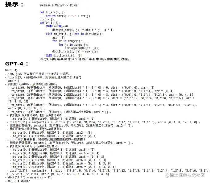 代码生成:GPT-4 能够在非常高的水平上进行编码,无论是从指令编写代码还是理解现有代码,能够处理广泛的编码任务,从编码挑战到现实世界的应用,从低级汇编到高级框架,从简单的数据结构到复杂的程序,还可以对代码的执行进行推理,模拟指令的效果,并以自然语言解释结果,甚至可以执行伪代码,这需要解释在任何编程语言中都无效的非正式和模糊的表达。如下图为 GPT-4 执行 Python 代码案例: