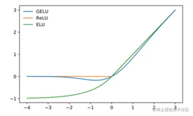 - 将 GLUE(Gaussian Error Linear Unit)作为误差函数,GLUE 可视为 ReLU 的改进方法,ReLU 将小于 1 的数据转换成 0,大于 1 的部分不变,而 GELU 对其稍做调整,如下图所示: